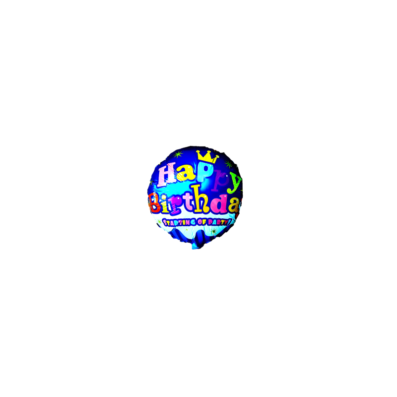 A Blue foil balloon, with a Happy Birthday in rainbow colours brings cheer to the parties.