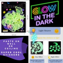 Moon, stars and other shaped fluorescent stickers which absorb light and glow in the darkness. Break off a tiny piece of the adhesive tape and apply to the back of each toy. |